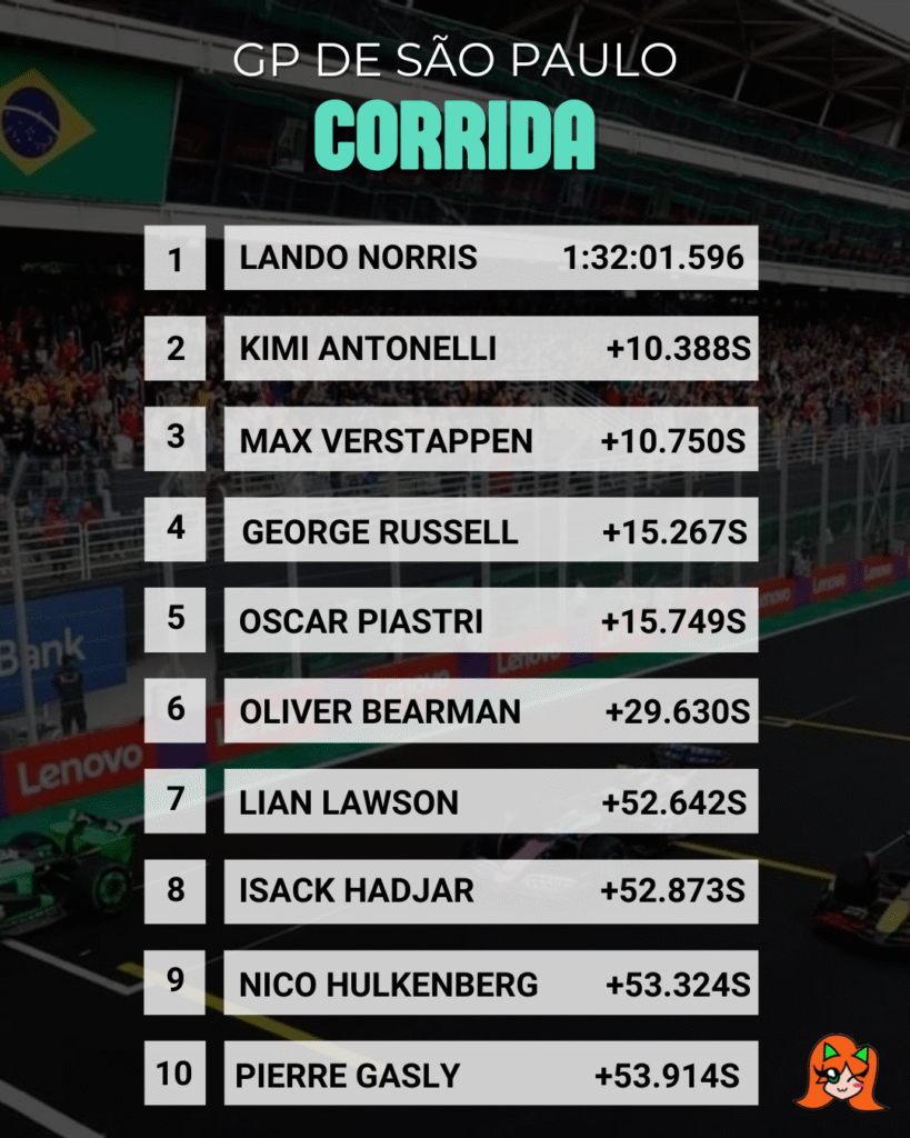 O domingo em Interlagos entregou tudo o que os fãs da Fórmula 1 esperavam: emoção, caos e uma vitória incontestável de Lando Norris. O piloto da McLaren largou bem, manteve a liderança com consistência e cruzou a linha de chegada no topo do pódio, enquanto Max Verstappen e Kimi Antonelli protagonizaram uma recuperação impressionante que garantiu suas posições entre os três primeiros.