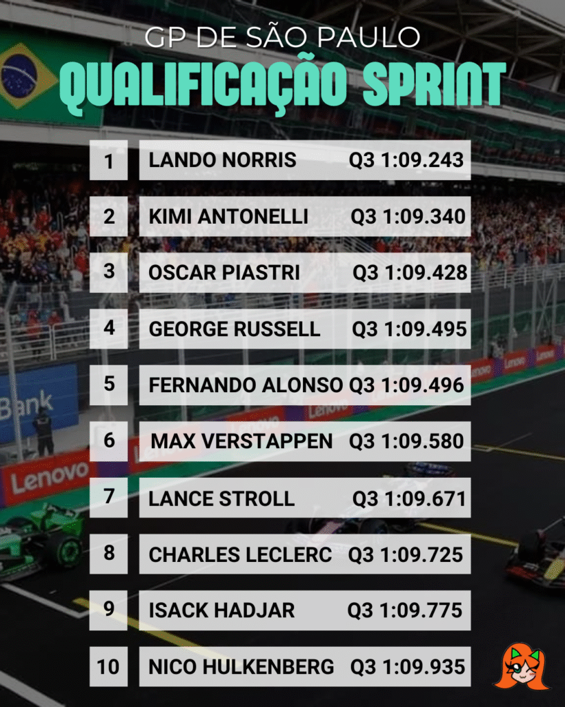 Lando Norris dominou a classificação sprint do GP de São Paulo e assegurou a pole position com autoridade. O piloto da McLaren registrou 1min09s243 e superou Kimi Antonelli, da Mercedes, que ficou com a segunda colocação. Oscar Piastri, companheiro de Norris, completou o top 3 e reforçou o bom desempenho da equipe britânica no circuito de Interlagos.