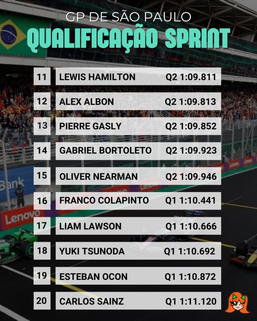 Gabriel Bortoleto, que havia impressionado no treino livre com o quinto lugar, não conseguiu repetir o ritmo na classificação. O piloto da Sauber marcou 1min09s923 e terminou o SQ2 fora da zona de corte, o que o coloca na 14ª posição de largada. Apesar disso, o brasileiro segue confiante para buscar pontos diante da torcida em casa.