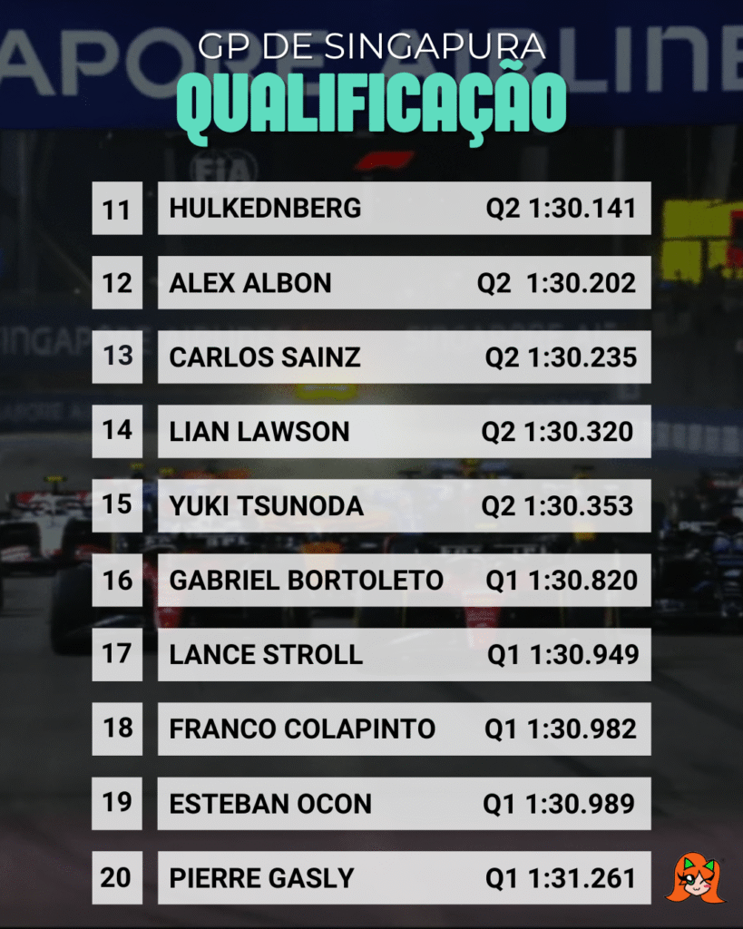 Enquanto isso, Gabriel Bortoleto enfrentou um sábado complicado. O brasileiro da Sauber caiu no Q1 e vai largar da 16ª posição. Desde o GP da Bélgica, ele não enfrentava uma eliminação tão precoce. De lá pra cá, ele chegou ao Q3 três vezes e ao Q2 em outras duas. Desta vez, uma bandeira amarela no fim da sessão atrapalhou sua última tentativa de volta rápida.