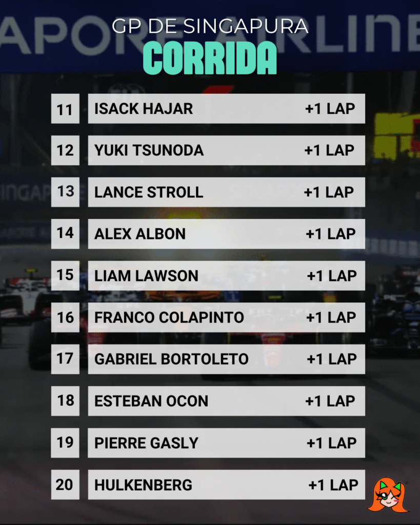 Apesar da vitória dominante de Russell, a prova não entregou grandes emoções. A única mudança relevante no top-3 aconteceu logo na largada, quando Norris ultrapassou seu companheiro Oscar Piastri. Depois disso, os ponteiros mantiveram suas posições até o fim.