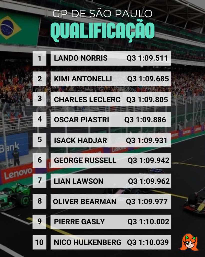 Lando Norris confirmou o bom momento na Fórmula 1 e conquistou a pole position para o GP de São Paulo, que acontece neste domingo (9), no Autódromo de Interlagos. O piloto da McLaren registrou 1min09s511 e superou Kimi Antonelli, da Mercedes, que completa a primeira fila. Charles Leclerc, da Ferrari, larga em terceiro, seguido por Oscar Piastri, companheiro de Norris.