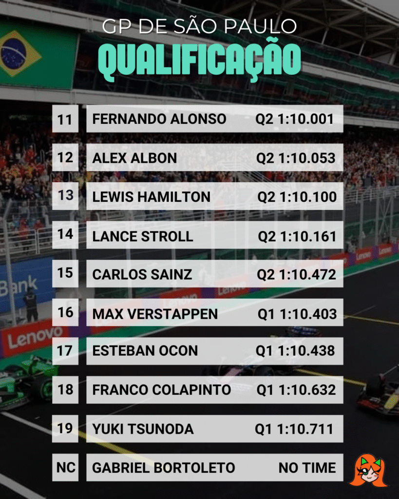 Max Verstappen também decepcionou. O tetracampeão da Red Bull caiu ainda no Q1 e vai largar apenas da 16ª posição. O holandês reclamou da falta de aderência e não conseguiu repetir o desempenho do ano anterior, quando venceu em Interlagos após sair de 17º.